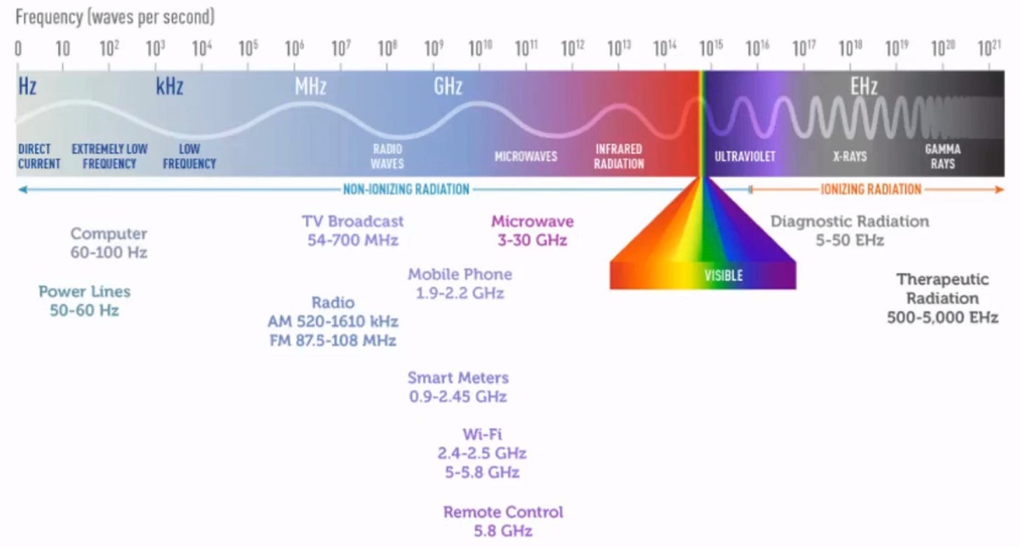 Radiofrequency (RF) fields: Are a type of electromagnetic radiation used for wireless communication. They are emitted by devices such as cell phones, WiFi routers, Bluetooth devices, and microwave ovens. While electric and magnetic fields are usually low frequency and found in household electrical systems, RF fields are higher frequency and are used for transmitting data wirelessly.
